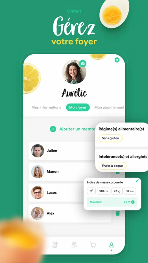 Je rentre les données au moment de la création du compte : prénom, âge, taille, poids, niveau d’activité physique et s’il y a des intolérances, allergies, régimes pour moi et les membres de mon foyer.