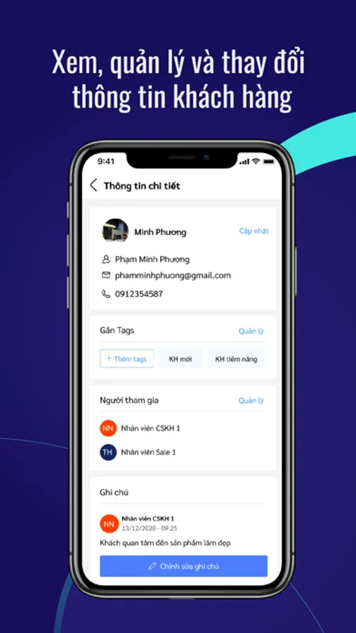 - Quản lý thông tin của khách hàng: Các thông tin như Email, Số điện thoại, Thẻ tags, Nhân viên chăm sóc sẽ liên tục được update khi xem Thông tin khách hàng