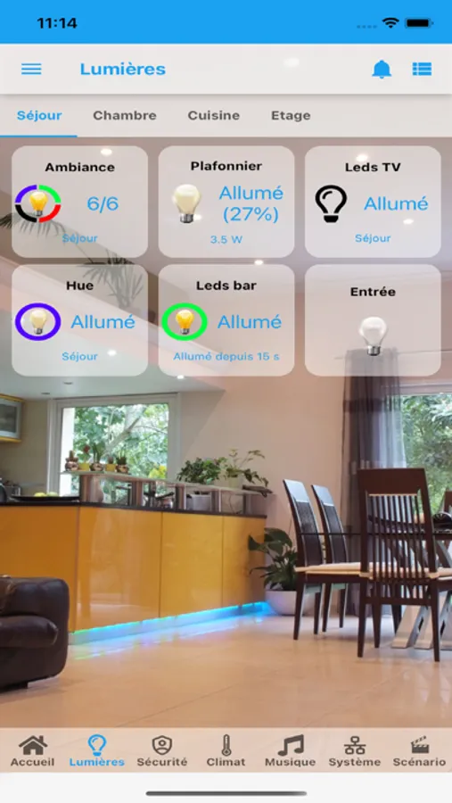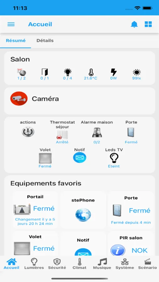 - Affichage et gestion de vos équipements domotiques et des scénarios