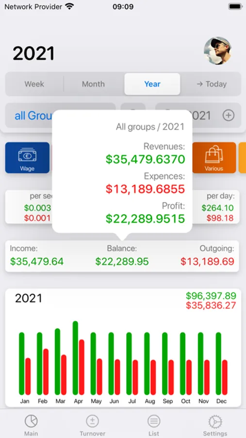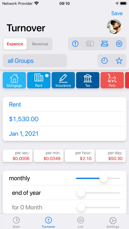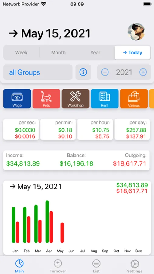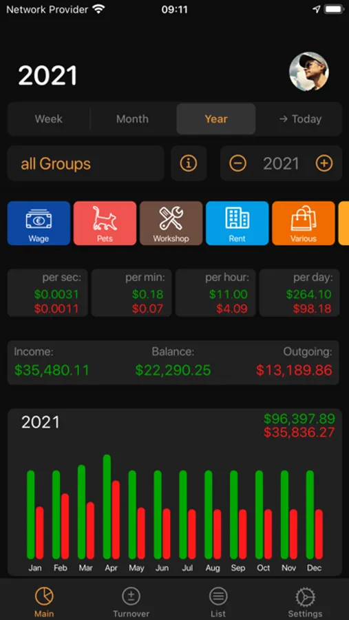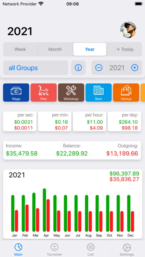 Record all your turnover and LiveBudget will calculate your running costs per second, minute, hour or day and visualizes how your budget is changing recently.
