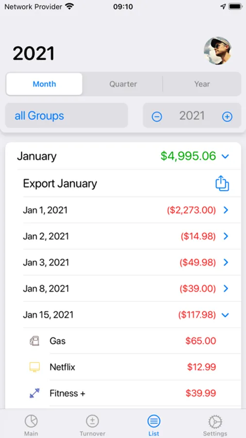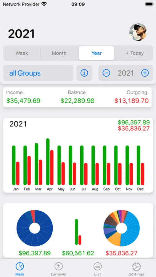 The evaluation of your finances and their presentation and calculation can be performed either per calendar year, per month, in a two-week interval or over a period from the beginning of the year until the present day.