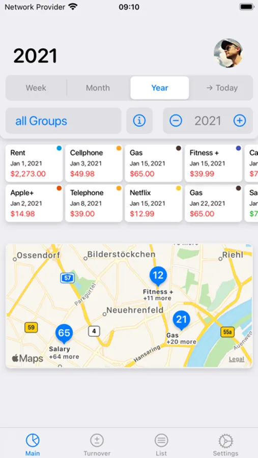 Revenues and expenses can be entered with minimal effort, repetitions are generated in typical intervals and displayed in categories and groups. If required, a receipt can be assigned, either scanned via camera or taken from your photo library. In addition, the location of the record is stored. Your entries are color-coded, organized into groups with associated categories and illustrated with customizable icons. Of course, sales tax or VAT can also be taken and will be calculated automatically.