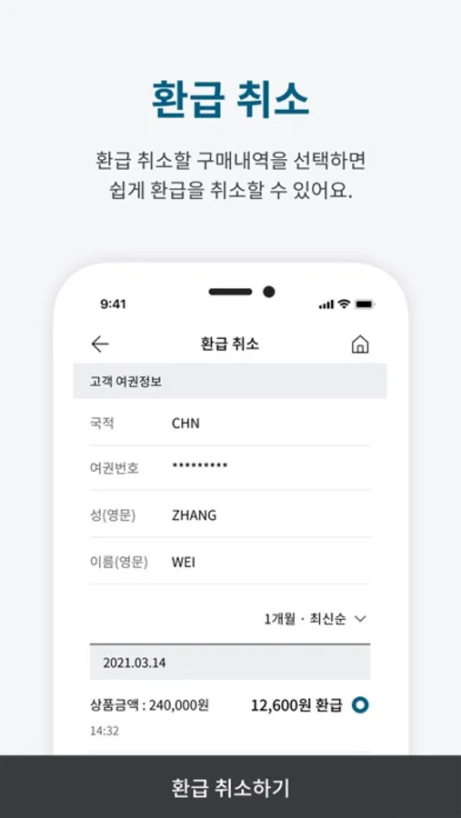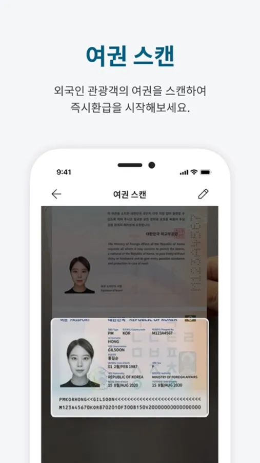 - 모바일 및 태블릿의 카메라로 외국인 관광객의 여권을 스캔, 복잡한 수기 작업 없이 자동으로 환급(텍스리펀드) 절차가 진행됩니다.