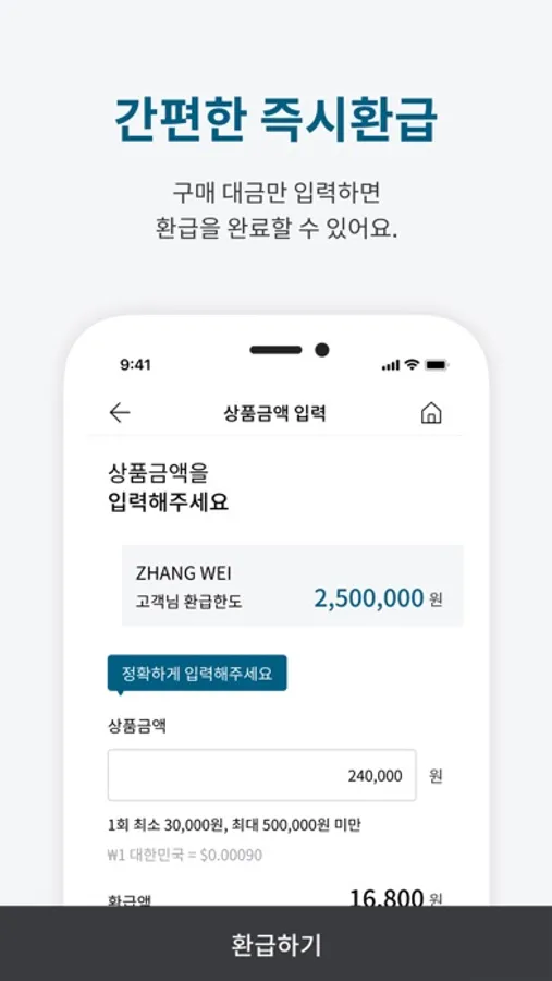 - 상품의 원래 판매 가격을 입력하면, 자동으로 환급금 및 환급 적용 판매 가격을 실시간 관세청 통신을 통해 처리합니다. 판매자(사업주)는 환급(TAX FREE)적용 판매 가격으로 기존과 동일하게 결제를 진행하시면 됩니다.