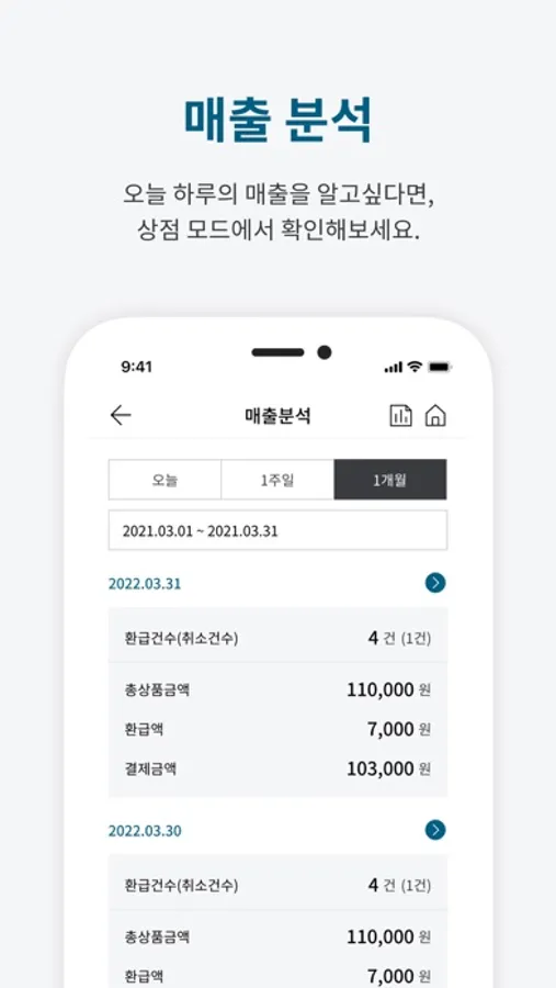 - 환급 매출 건의 이력을 연, 월, 일 별로 확인할 수 있습니다.