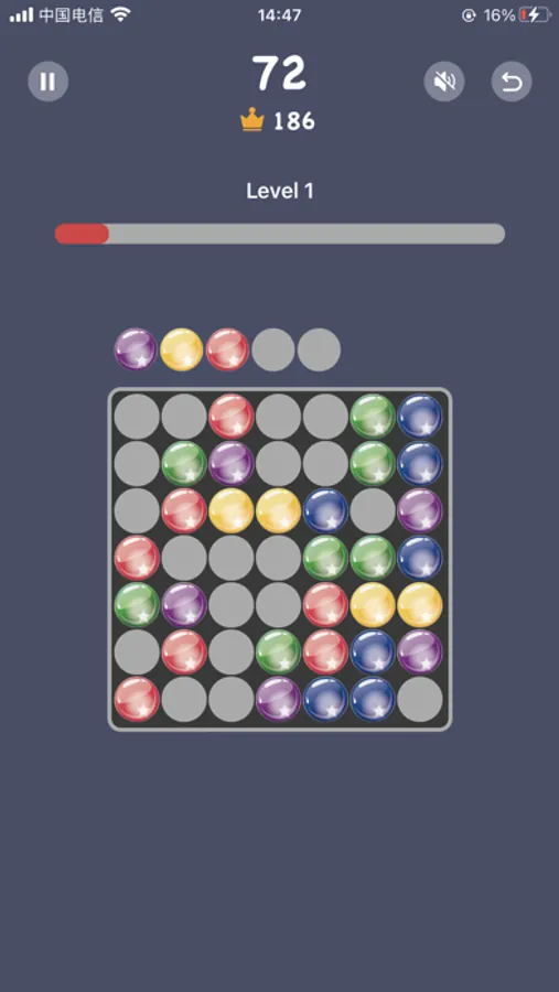 初始随机出现三个水晶球,同时在未来区显示即将出现的三个水晶球,玩家可以根据全部的水晶球数据,移动其中某一个到另其他位置。当某种颜色的水晶球在同一行或者同一列再或者某一斜线上连续有四个及以上就会自动消除;请注意:再移动过程中起始位置到终点位置有可通路才可以;