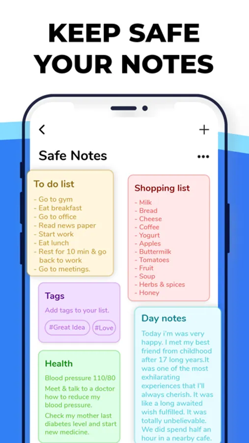 Write and keep safe your notes and make it private. Create unlimited number of notes, to do list and store secret information or ideas.