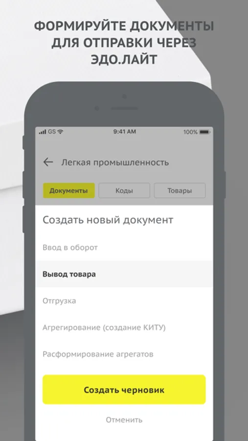 Бесплатное мобильное приложение для бизнеса для работы с маркированными товарами. Оно поможет вам оформлять документы без использования личного кабинета – напрямую на смартфоне. Просто отсканируйте необходимые коды через приложение, создайте документ и подпишите его электронной подписью. После этого он автоматически отправится в систему и отобразится в вашем личном кабинете.