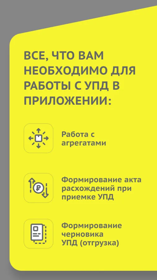 • Все, что вам необходимо для работы с УПД в приложении - формирование акта расхождений, работа с агрегатами, формирование черновика УПД