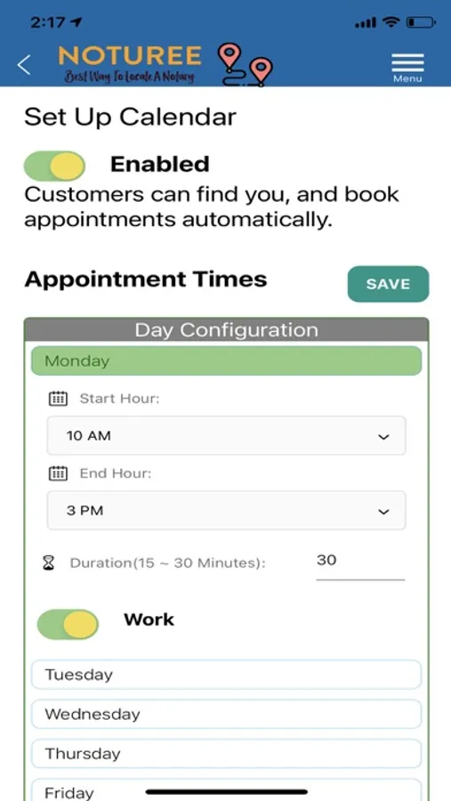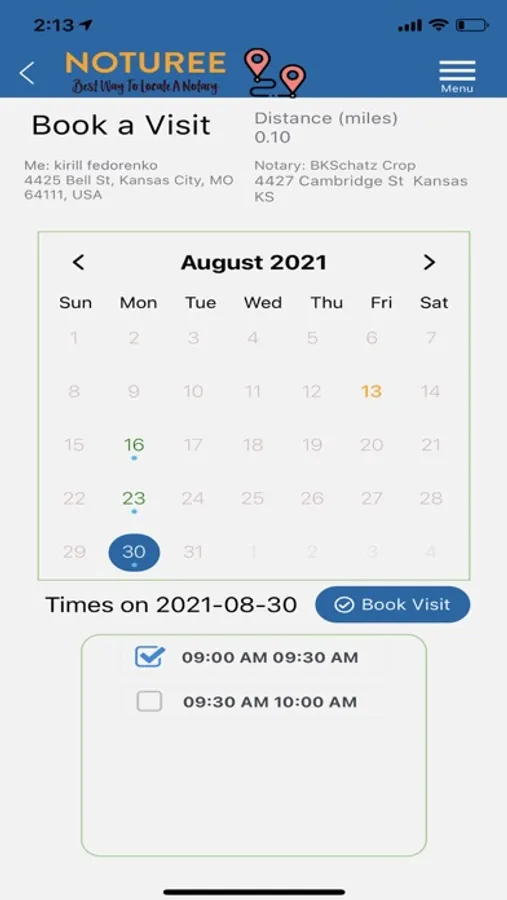 When the user selects a notary public, the available dates and times of that notary appear on the calendar. Then select a date and time and make a reservation.