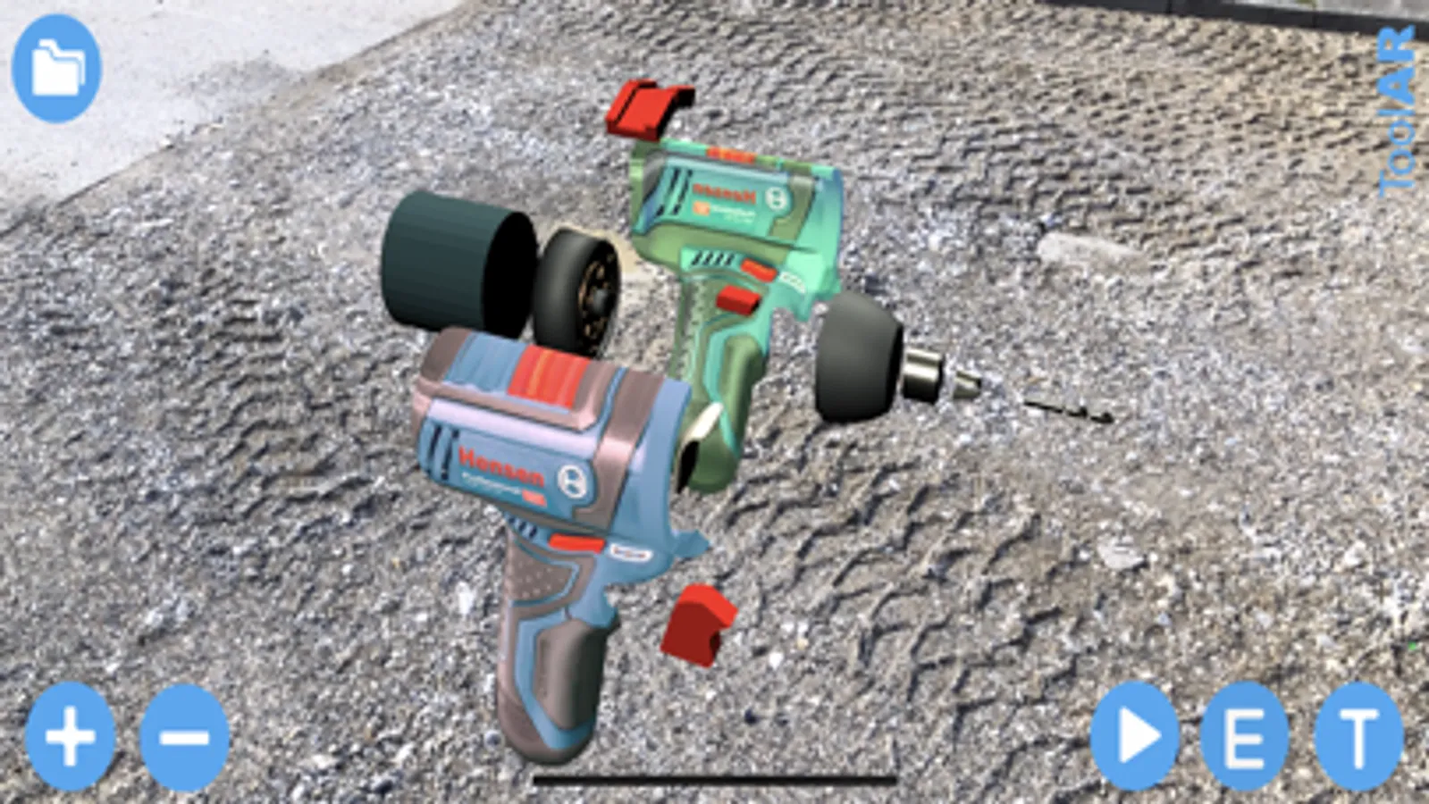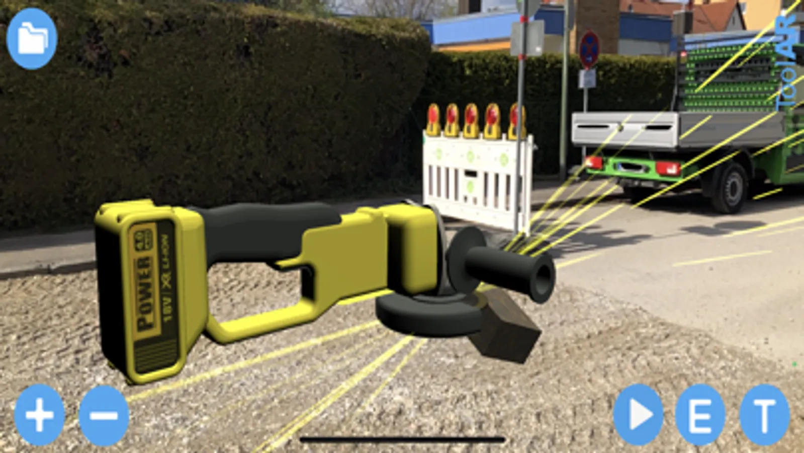 Probiere zwei Werkzeuge in Augmented Reality aus. 1. Akkubohrer: Vier verschiedene Aufsätze aufstecken, den Sound des Bohrens anhören, ins Innere schauen in einer Explosionsdarstellung. 2. Flex: Einen Metalblock anfräsen, sodass die Funken sprühen