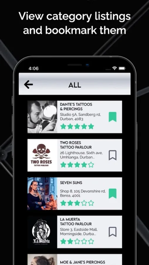 - Category and Search Feature: Filter artists based on a selected category style, i.e. piercing or tattoo art, or use the search feature if you are searching for something specific.