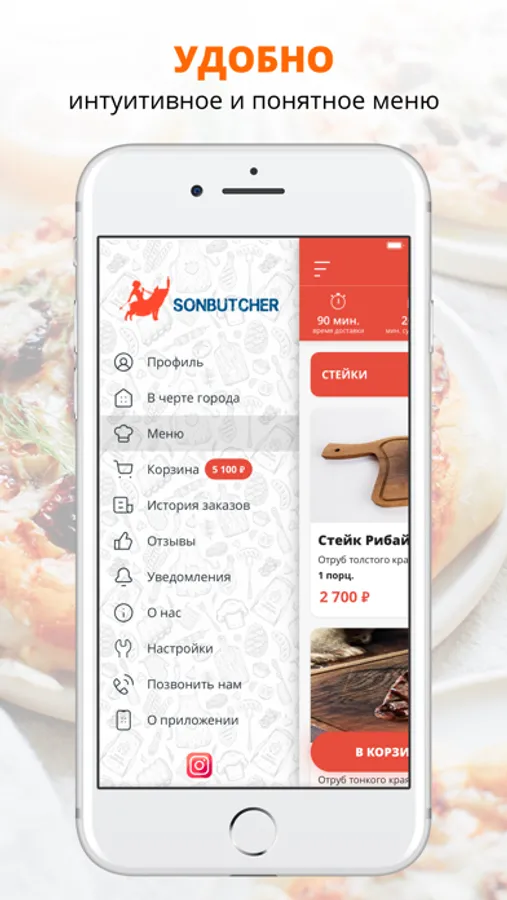 В разделе «Сын Мясника» найдете фирменные стейки, бургеры, салаты и горячее.