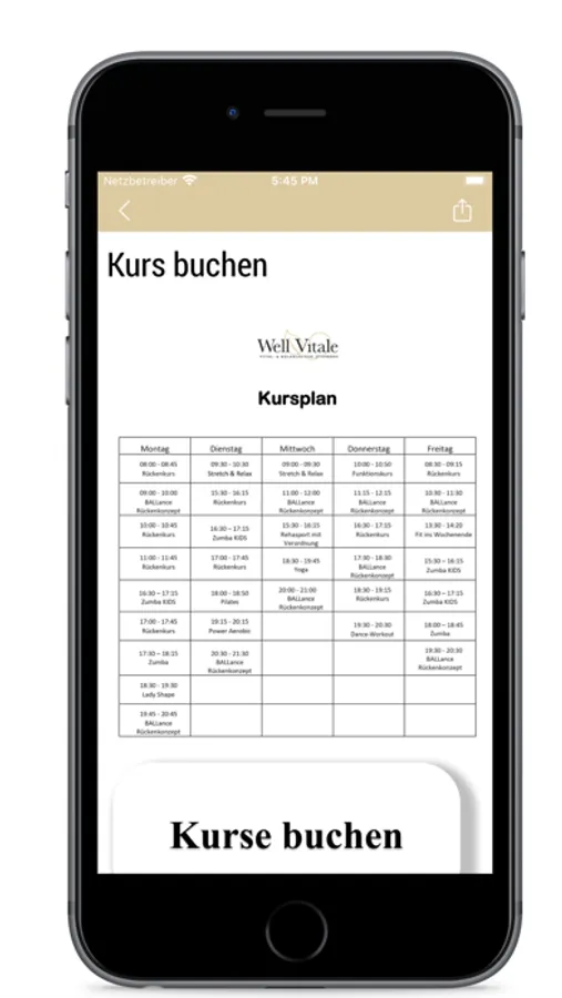 Yoga, Power Kurse, Tanz oder Ballance Rückenkurs – Sie haben Lust auf Bewegung, wissen aber nicht, welche Kurse heute im Programm sind? Dafür haben Sie nun die Wellvitale-App. Halten Sie aktuelle Gruppenkurspläne stets griffbereit und machen Sie spontan mit oder planen Sie, welche Kurse am besten in Ihren persönlichen Zeitplan passen. Sie wissen nicht, was hinter den Kursnamen steckt? Keine Sorge, neben Details wie Zeit und Ort des Kurses, können Sie auch Kurzbeschreibungen einsehen und sich dann für Ihre Lieblingskurse entscheiden.