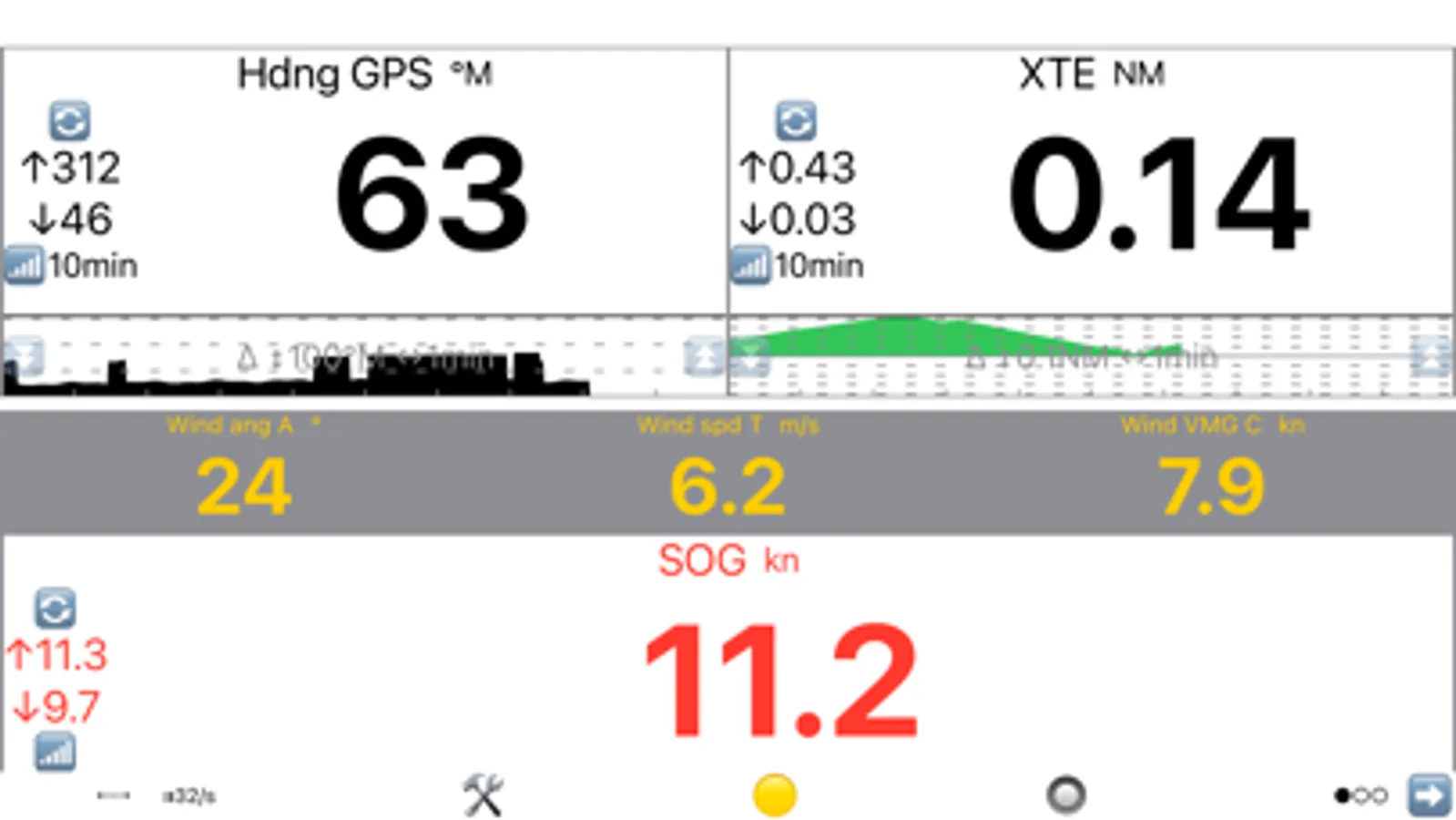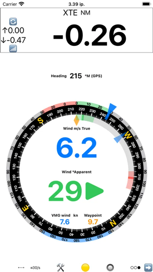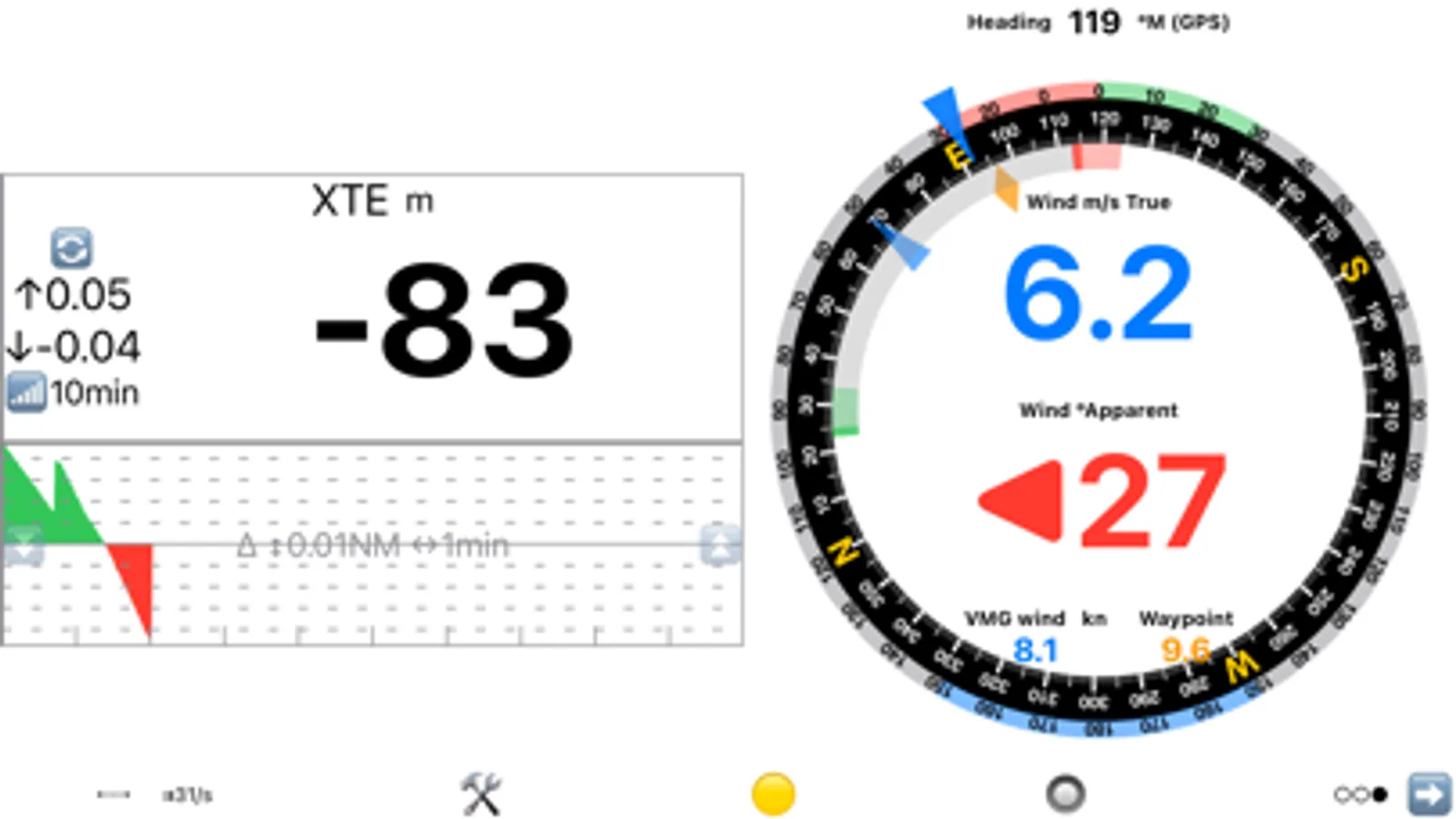 The Wind Display has all key sailing information in context aware analog format. It provides comprehensive wind and heading information in both analog and digital format. It is based on the sailing context: going upwind, downwind or towards a waypoint and enhanced by the polars data.