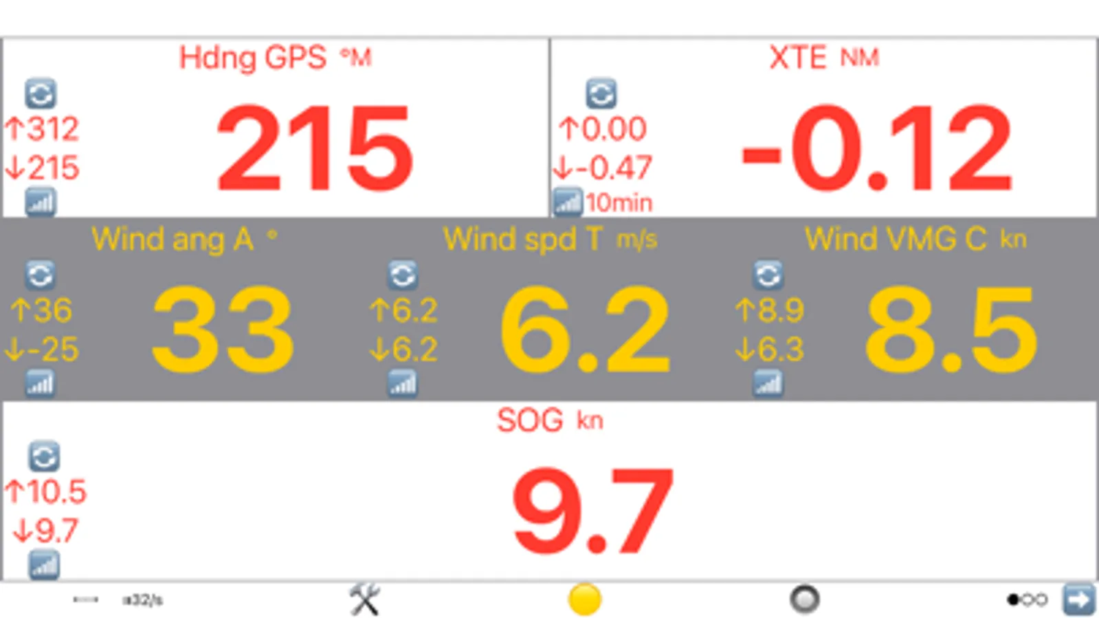 The following data items ("measurements") are read from the NMEA data stream or derived from these and the boat's polar data..