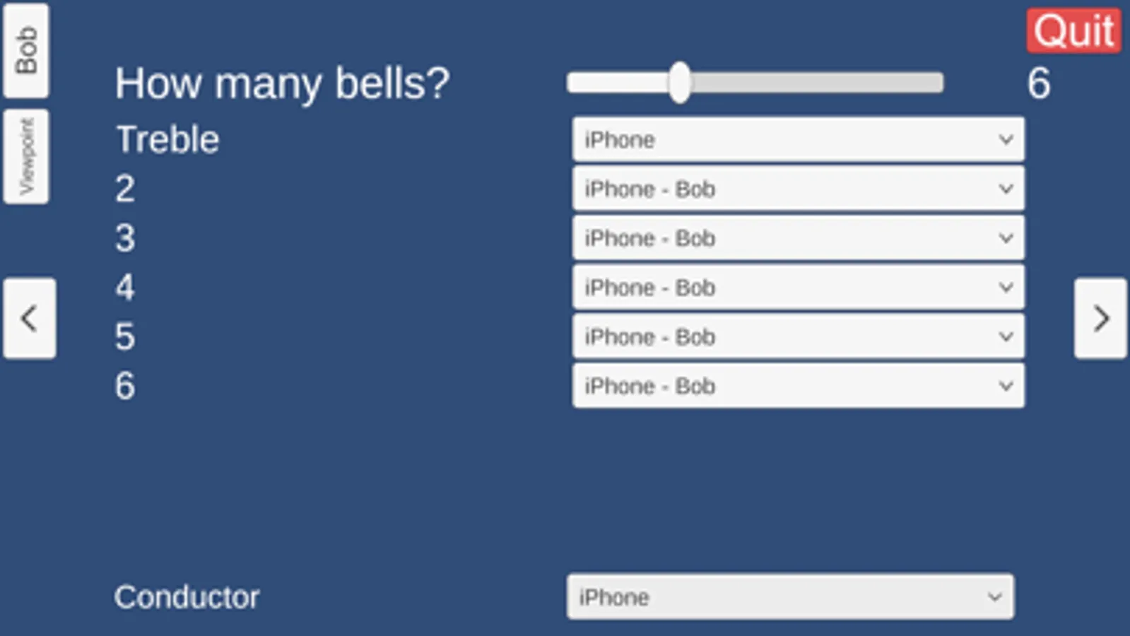 "Bob" is an automated ringer who can ring as many bells as you wish. This enables you to ring things that would be impossible in the tower due to a lack of sufficient ringers or bells! When you create a tower, at startup you are assigned the treble of six bells, and Bob rings the other bells. One of the pages that you can swipe to allows you to choose the method that Bob will ring.
