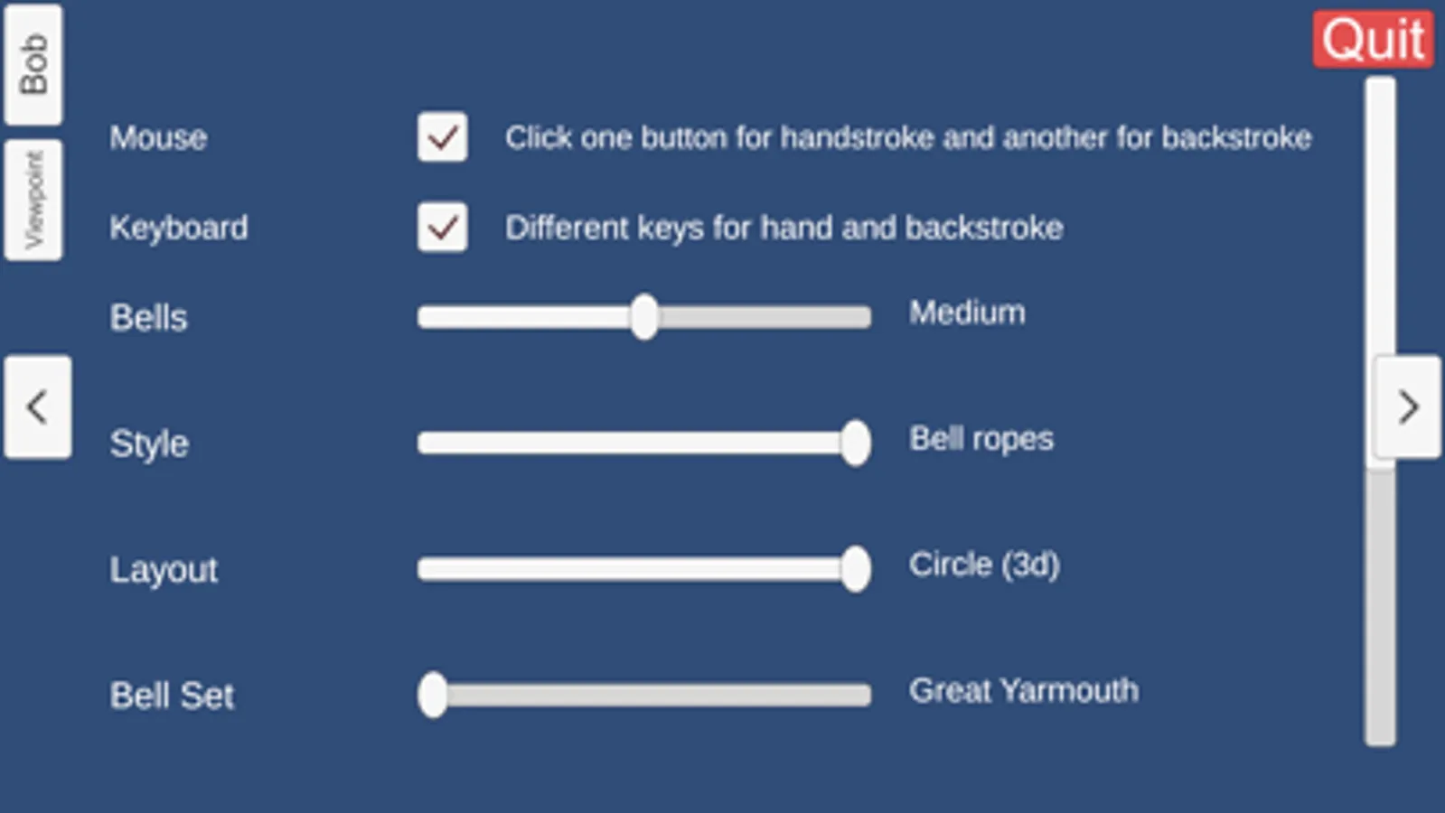 Another option available is to ring using buttons instead of ropes. In this mode the bell rings immediately when you press the button, so it resembles handbell ringing more than tower bell ringing.