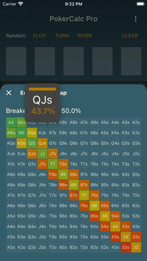 - Hand evaluations include hand type analysis and heat maps to quickly visualize the odds.