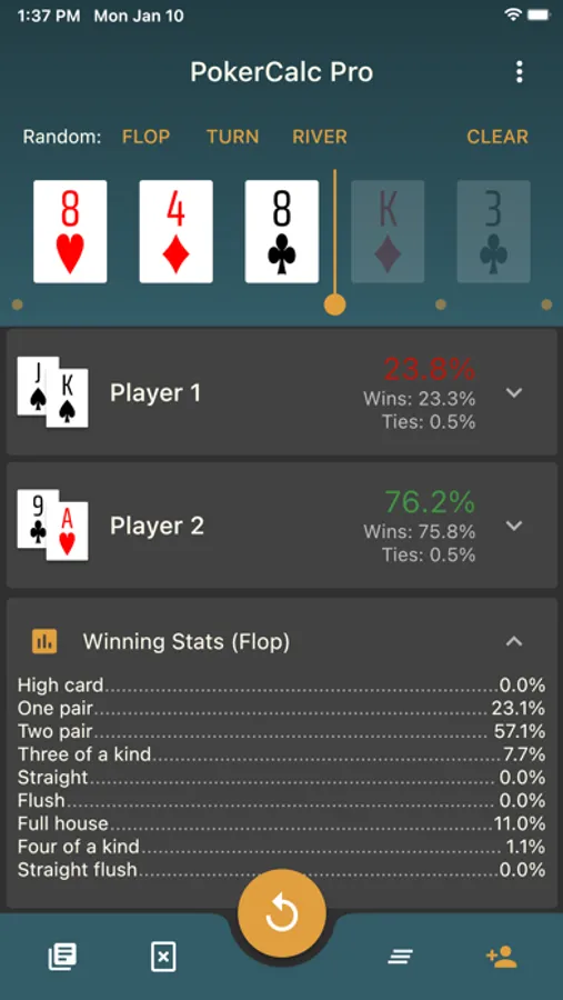 PokerCalc Pro is a lightning fast odds and equity calculator for Texas Hold 'em. Features include: