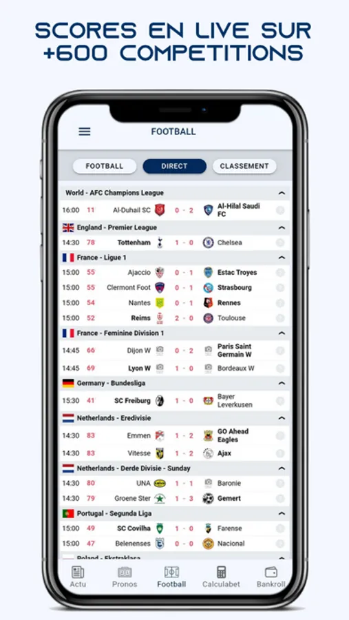 Avec le live-score, vous accédez aux informations essentielles. Il vous suffit de sélectionner vos matchs, équipes ou compétitions de football parmi les plus de 830 que nous couvrons.