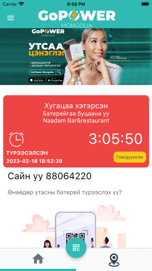 We are gladly introducing GoPower app allows you to RENT POWER-BANK FOR YOUR SMARTPHONE using applicable payment instrument. The app is very simple and user friendly which requires no deposits, free sign ups and no long registration process but need only your mobile phone number. You can easily RENT POWER-BANK FOR YOUR SMARTPHONE as scanning the QR code on the stations placed throughout Ulaanbaatar city, Mongolia.