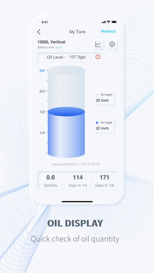 Usage record:Through the chart to record your heating oil usage on an hourly basis, you can use the chart to see how your heating oil is used in that day, week, month and year.
