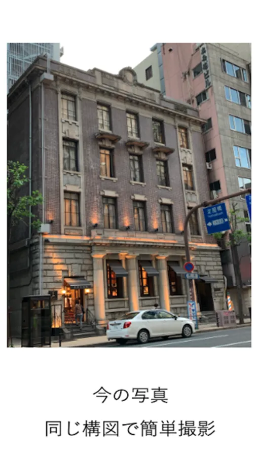 昔の写真に今の風景を重ねて同じ構図で撮影。今昔写真が簡単に撮れる。