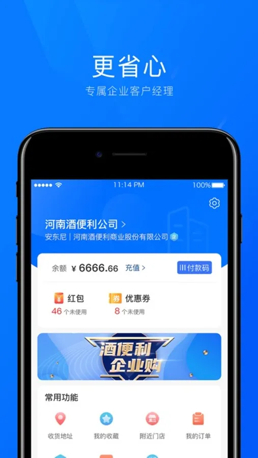 酒便利企业购依托河南酒便利商业股份有限公司的商品及供应链服务能力,专为企事业单位服务,由专业的销售团队提供各种定制化的采购解决方案。以“省”为利益点,帮助企业会员省钱、省心、省时间