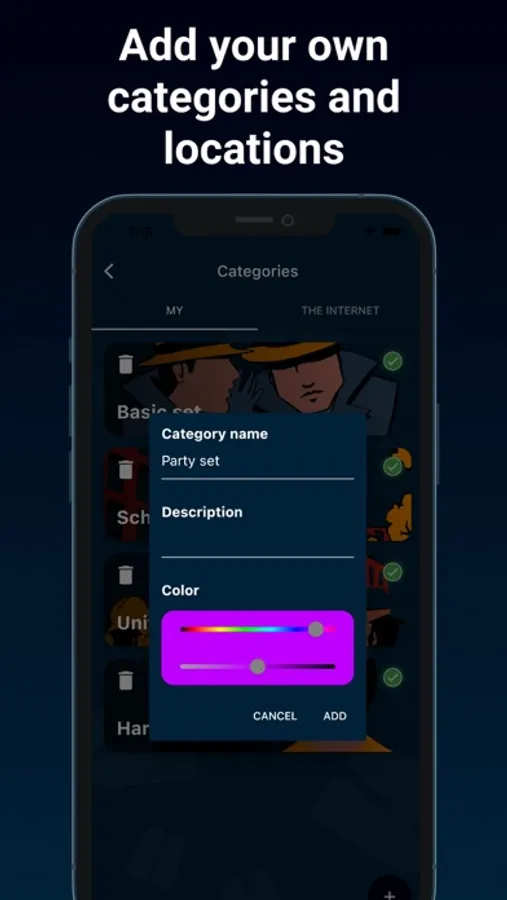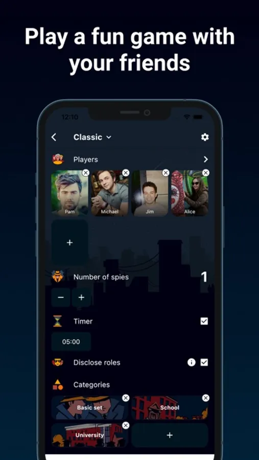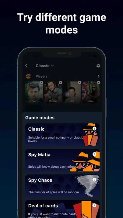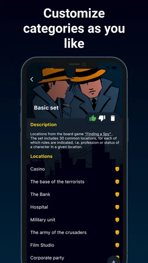 You will be able to create online distributions, receiving a code by which other players will connect, choose the number of players, the number of spies and the leader, add or remove hints, set a timer to control the time of a round or a move, and add roles that affect the player's behavior in the course of the game.