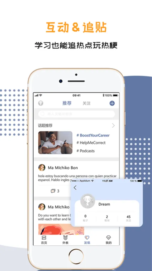 波卡外教是一家专注于英语学习的在线教育平台,真人外教1对1,每节25分钟。内含丰富优质的英语绘本、英文广播等英语学习资料,学员可以跟宝宝随时随地听绘本故事,练习每日听力。教程涵盖了少儿到成人的学习需求,学员可自主查询外教信息、外教证书并且选择外教,自由切换,学习无忧。【话题讨论】根据话题,进行讨论交流,分享不同观点和学习经验,加深理解,拓展知识点。