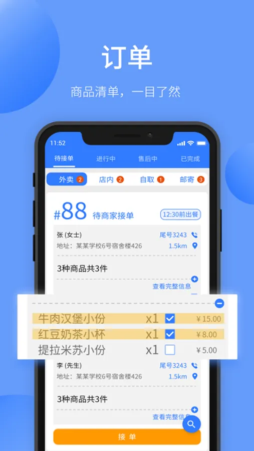 是专为外卖或跑腿等平台提供的商户端系统,主要有:人员管理、订单记录、店铺管理、财务对账、财务统计等功能,为商户定向、准确推送订单,提供清晰的收益记录、统计和数据分析,操作步骤简单方便。