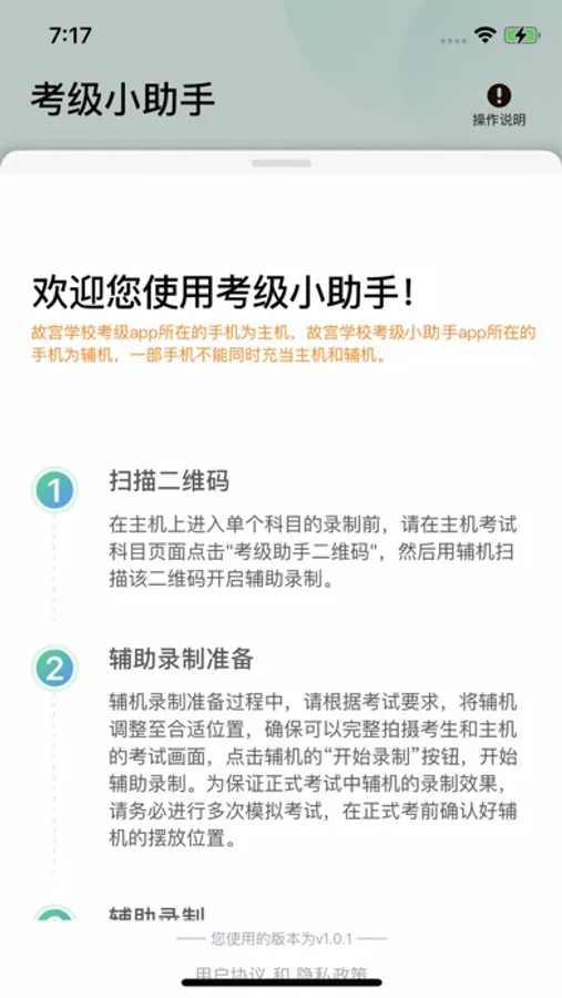 考级小助手主要是辅助在线视频考级进行双机位考试监控。考生只需扫描主机二维码,启动辅机位录制,点击确定,即可进行辅机监控录制。