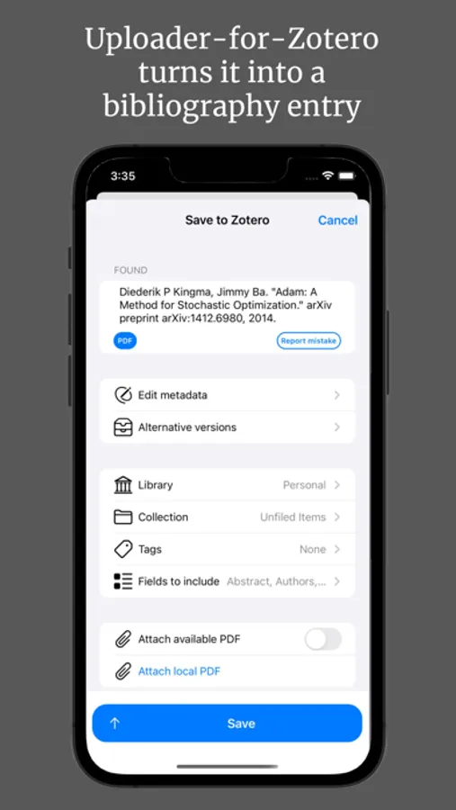 Uploader-for-Zotero automatically pulls in data from journal articles (such as those found on ArXiv.org or Nature.com) to create the perfect bibliography entry that can directly be added to your personal Zotero library.