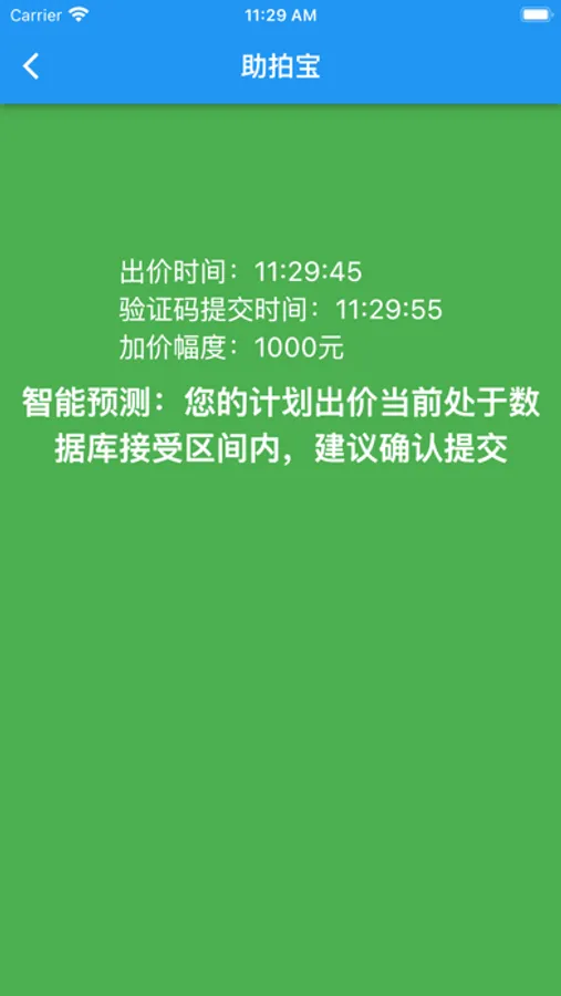超级沪牌助拍宝作为手机拍牌辅助工具,在用户设置拍牌策略后,在加价出价和提交验证码的关键时刻进行语音倒计时和播报,同时提供智能出价预测,帮助用户判断出价是否处于数据库接受区间内,帮助用户进行决策,从而提高拍牌成功率。