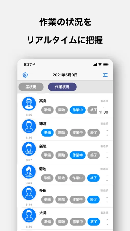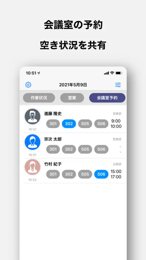チーム行動管理はリアルタイムで状況を共有できます。例えば、メンバー同士での在席状態であったり、作業の進捗状況であったり、会議室予約などにも応用出来ます。