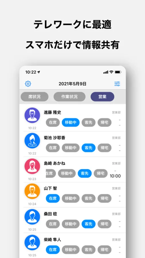 在宅勤務、テレワークなどで遠隔でのお仕事の方達はこのアプリでメンバーへの報告や状況の共有にご利用ください。