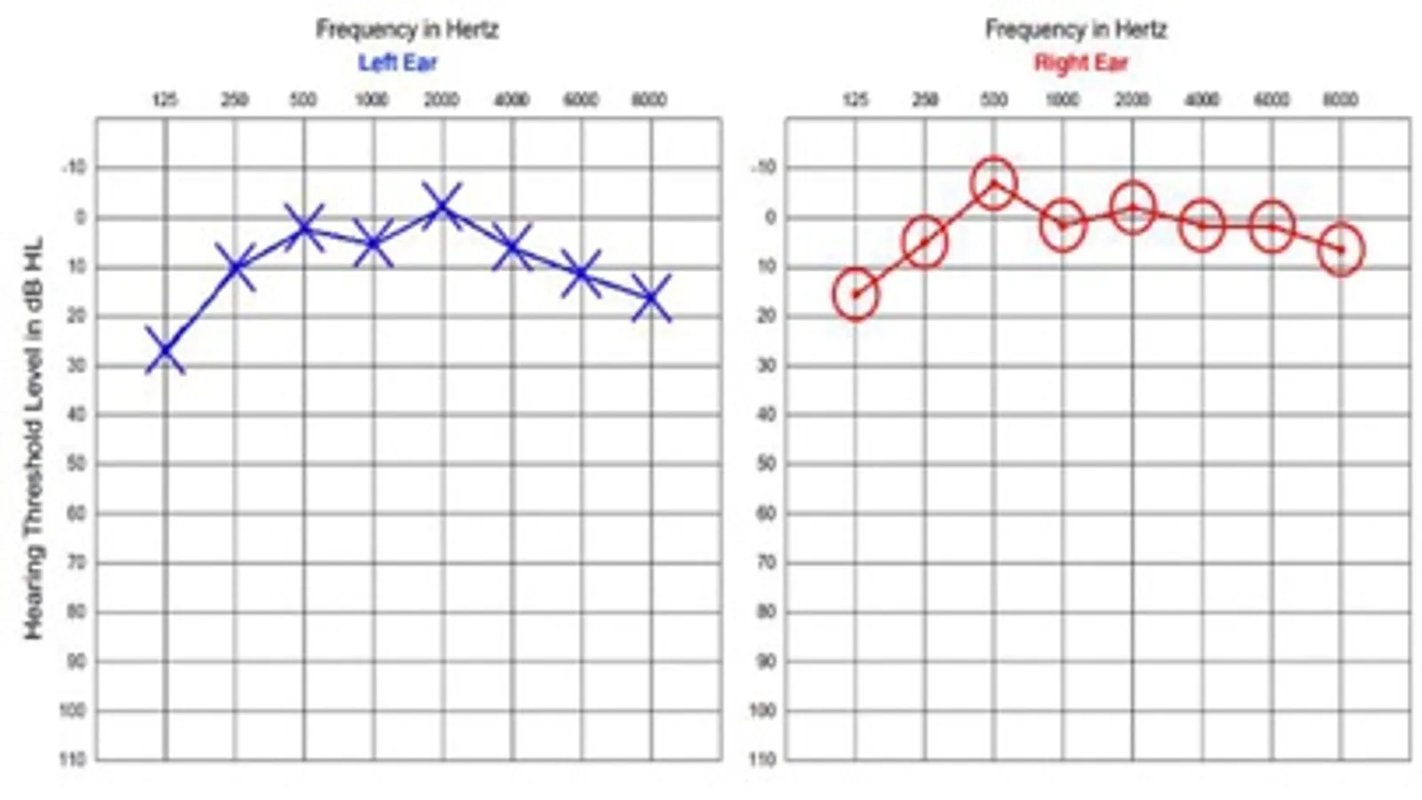 Audiogram is a graph that shows the minimum audible level of the standardized frequencies as shown by the audiogram. This is called the hearing threshold. In it, the axis of sound intensity measured in decibels is represented as the axis of frequency measured in hertz. The threshold (degree) of hearing is plotted compared to the uniform curve representing "normal" hearing.