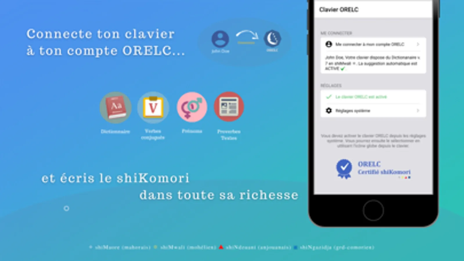 Le clavier ORELC permet d'écrire dans le dialecte shiMaore (mohaorais), shiMwali (mohélien), shiNdzuani (anjouanais) ou shiNgazidja (grd-comorien) en conformité avec les règles orthographiques du shiKomori (comorien).