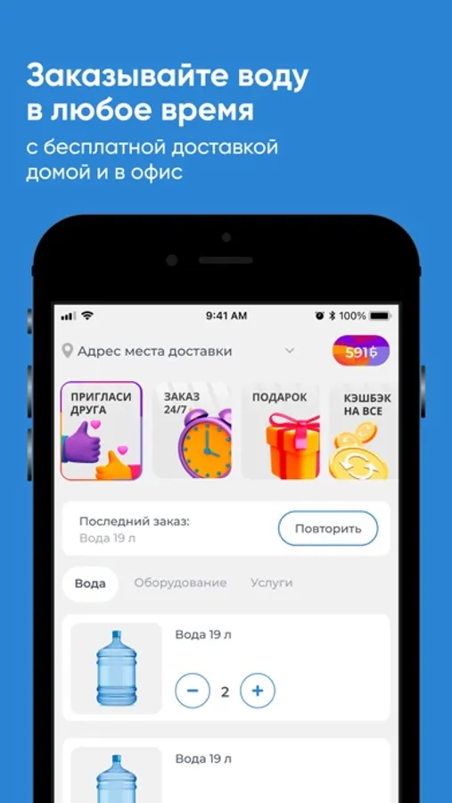 Скачайте приложение «Живая вода Чита» на свой смартфон и делайте заказ воды 24/7. Вы сможете повторять заказ нажатием одной кнопки, видеть всю историю покупок и быть в курсе всех акций компании.