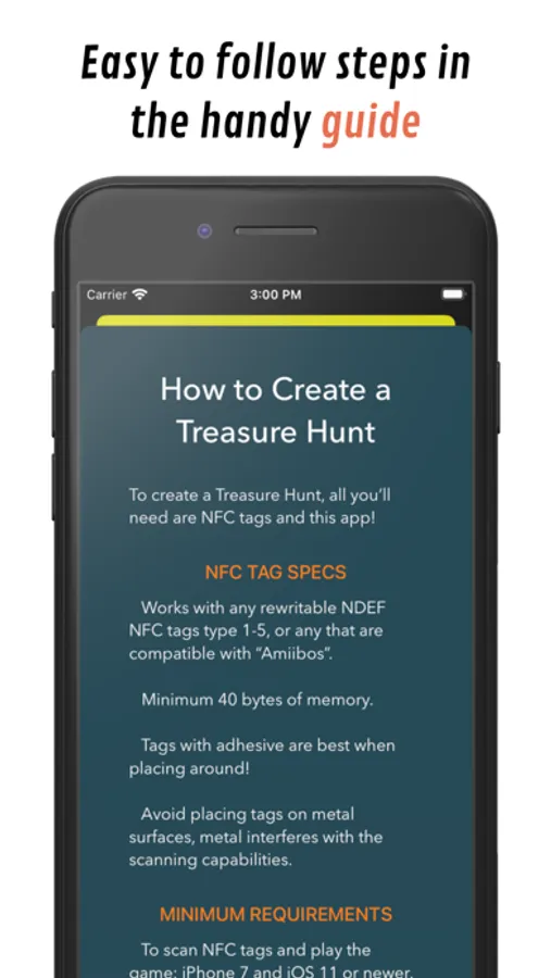 iOS13 or later is required to create Treasure Hunts by WRITING to NFC tags.