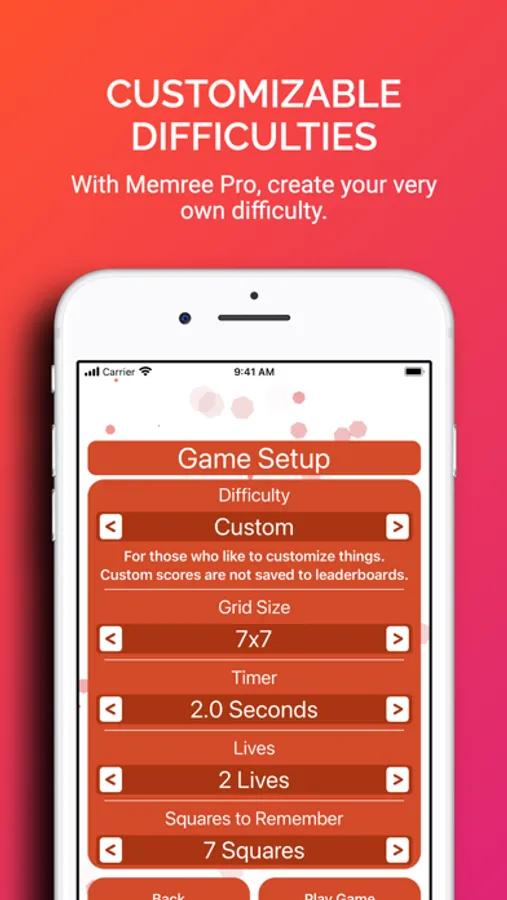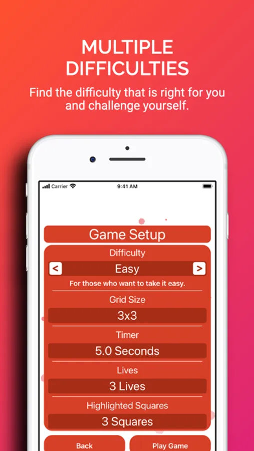 Test your memory with Memree! Memree is a memory game that challenges you to remember a grid of squares. You get one point added to your score for every grid you can successfully remember, and the aim of the game is to see how high you can get your score. Compete with others around the world with Leaderboards for every difficulty and improve your memory along the way.