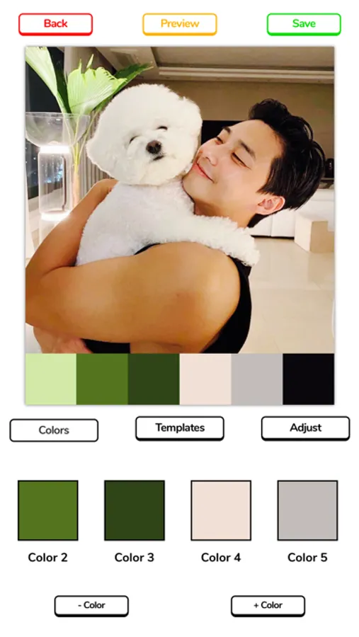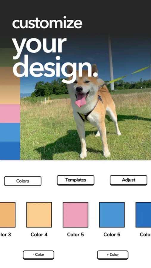 First, select your photo and then pick colors to add to the color palette. Personalize your color palette with templates, size, shape and spacing options. Add up to 10 individual colors and edit with endless customization possibilities.