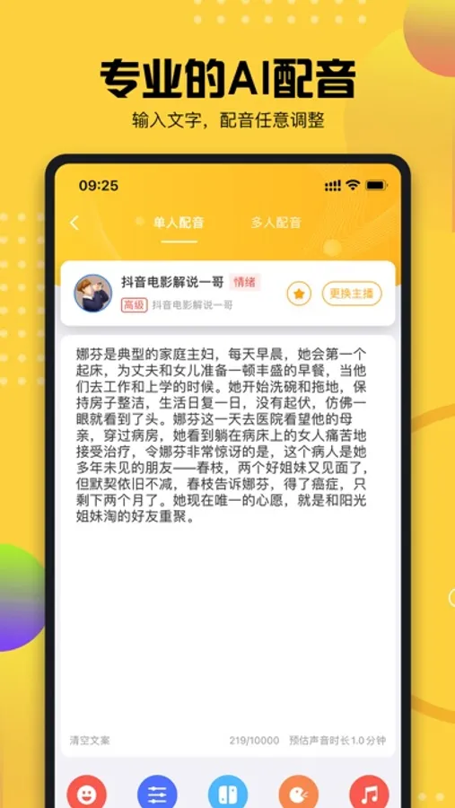 牛片配音是牛片网提供的智能语音合成服务,由人工智能机器人24小时在线服务,用户输入文字内容,选择配乐和人声模板,3秒小时生成配音。智能配音是人配音员缺席的最佳备选品,为自媒体及影视从业者省人力成本,减少人为不受影响,保证项目按时交付。