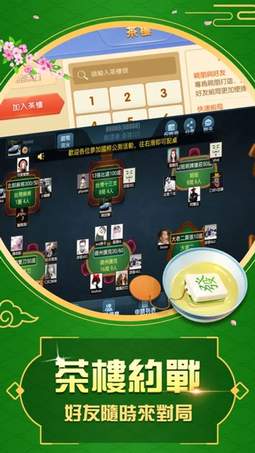 茶樓場:讓您在手機上有著麻將館的真實體驗。