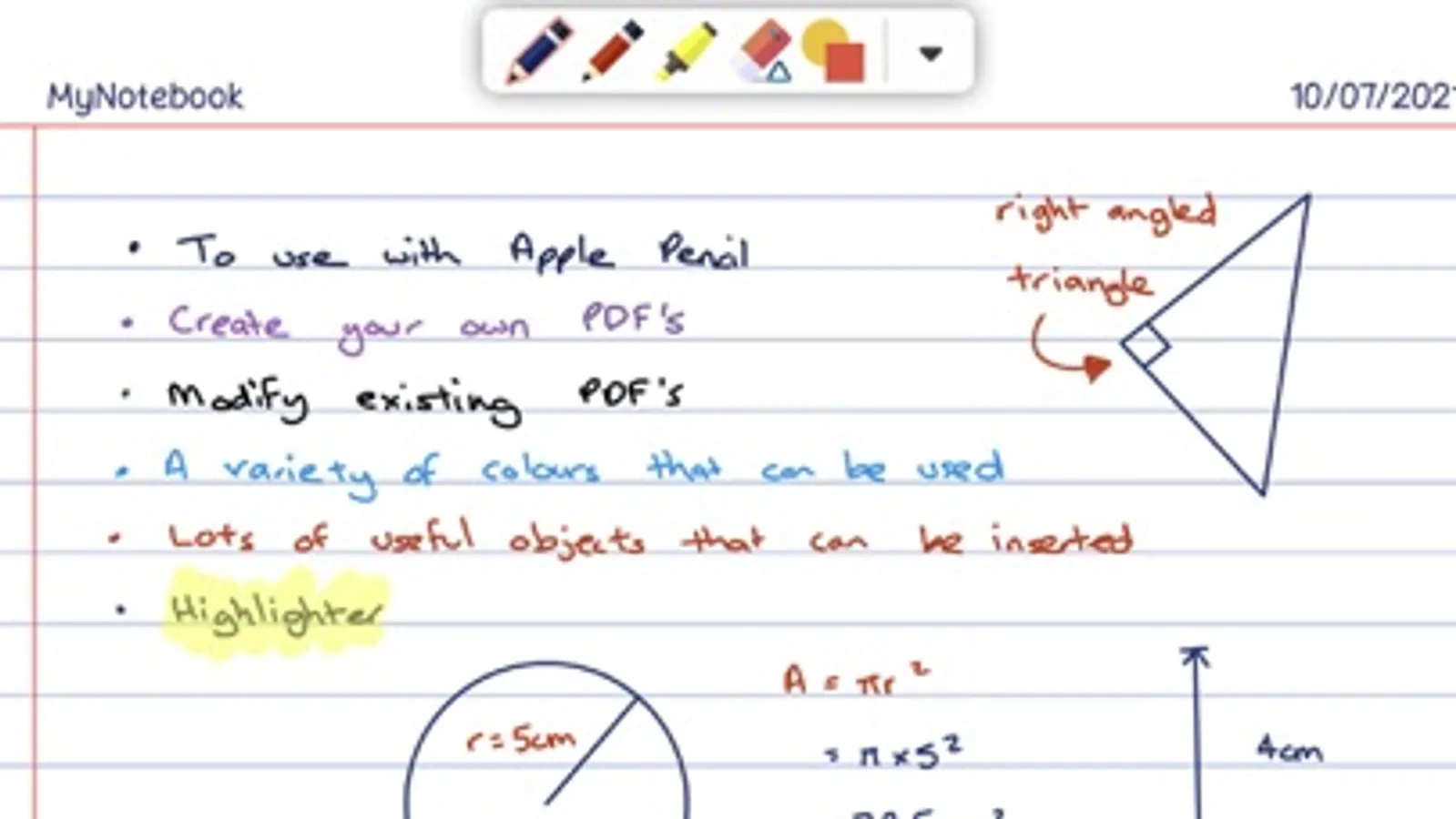 This simple, but powerful app allows users to either take notes on a new or existing PDF. A variety of bright and colourful markers ensure that your notes are always looking their best. A range of objects can be inserted, including circles, triangles and a range of maths shapes. A perfect app to be used for recording notes a classroom.