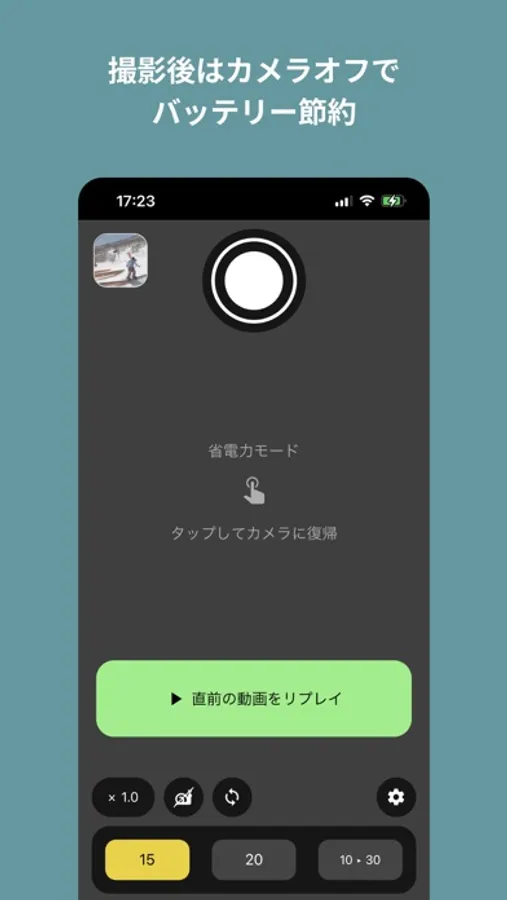 指定した秒数が経過後、自動で録画を停止します。録画後は省電力モードに移行し、長時間の録画や充電の切れやすい寒い環境でもバッテリーを節約することができます。
