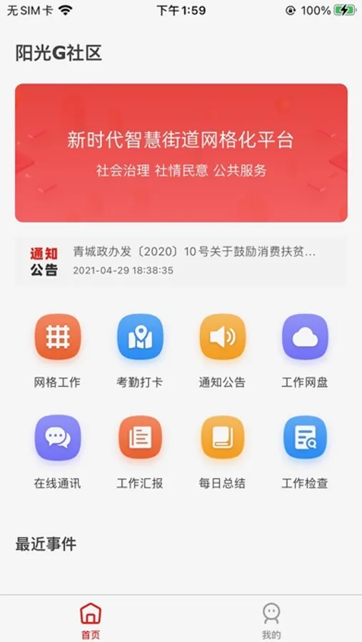 阳光G社区APP是为街道打造的城市智慧管理移动端软件,街道工作人员可通过移动端实现网格事件上报,移动化办公等工作,具体包括网格工作、考勤打卡、通知公告、工作网盘、在线通讯、工作汇报、每日总结、工作检查等应用。
