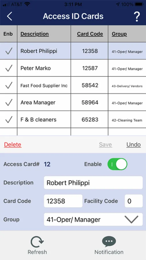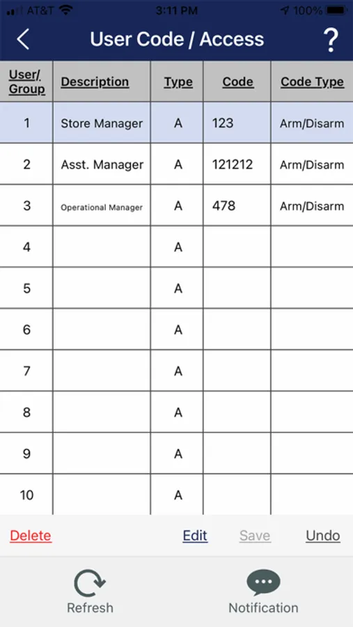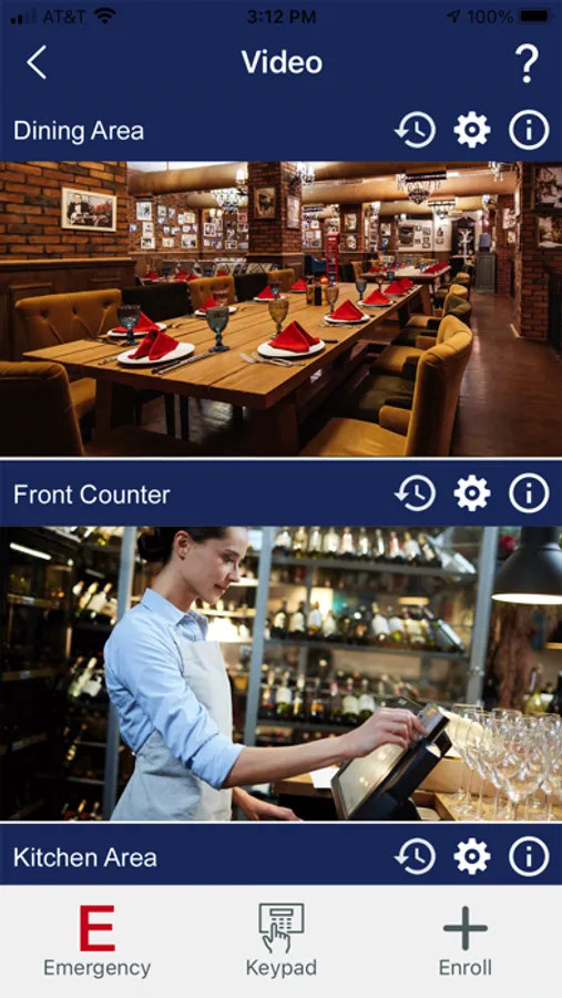 Easy intuitive mobile control of security systems and/or access systems, including users, via PIN and Card, address book, scheduling, and customizable Dealer Contact /About us area for account questions (via “?” Icon)