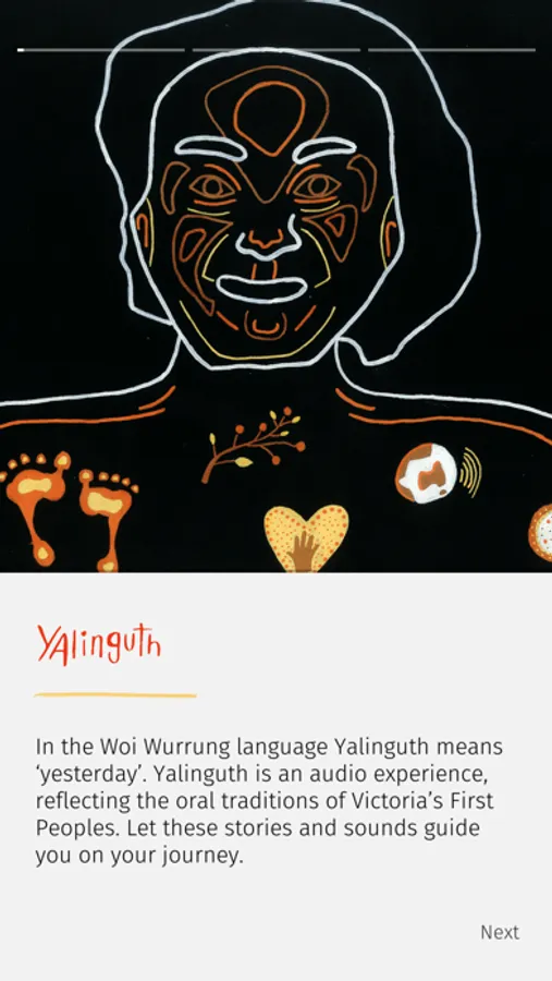 Yalinguth (“yesterday” in Woi Wurrung) is a mobile app/ audio augmented reality experience that connects people to place and history through geo-located soundscapes and stories told by Aboriginal and Torres Strait Islander communities. In keeping with oral traditions, and to minimise screens, Yalinguth is expressed entirely through sound. The overall premise of Yalinguth is guided by the words of the Elders that “we need to go back, to go forwards”.